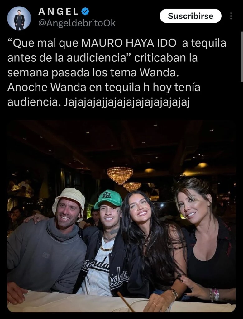 Ante lo sucedido, Ángel de Brito se expresó en su cuenta de Twitter y apuntó contra la mediática: "'Que mal que Mauro haya ido a Tequila antes de la audiencia', criticaban la semana pasada los team Wanda. Anoche Wanda en Tequila y hoy tenía audiencia".