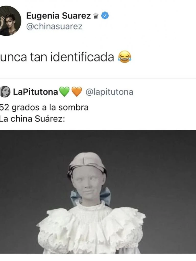 Así una usuaria compartió un tuit divertido que decía: “52 grados a la sombra y la China Suárez”. A lo que le agregó una foto de un maniquí. Lejos de enojarse, la pareja de Benja Vicuña se posó sobre esa publicación y escribió: “Nunca tan identificada”.