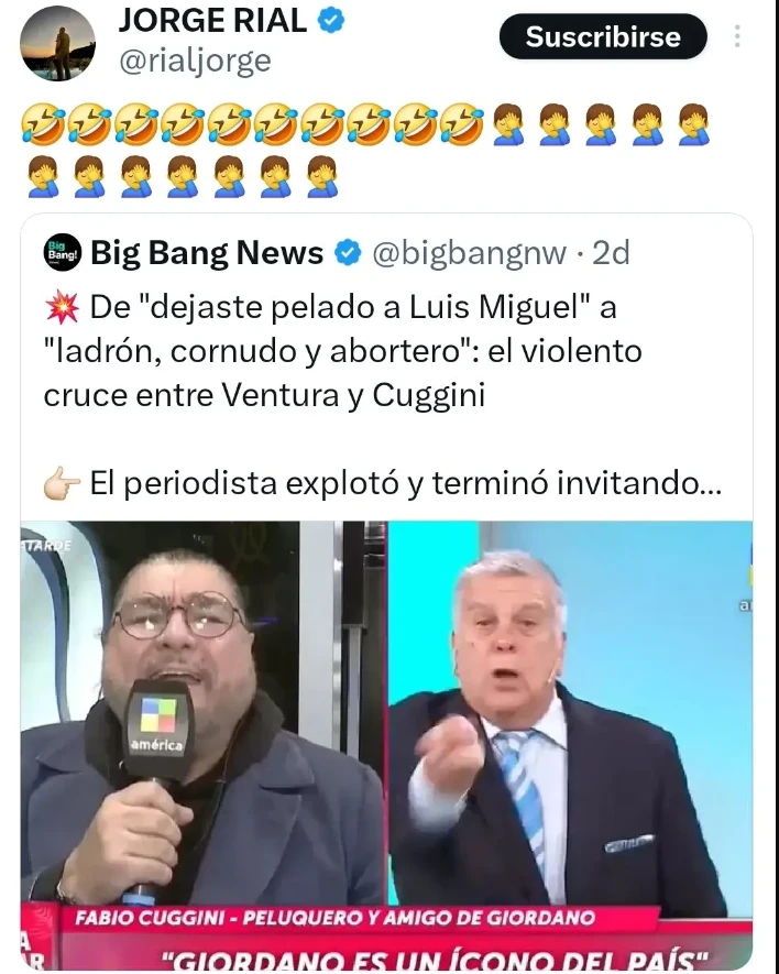 ¿Qué dijo Rial sobre el momentazo televisivo de su ex amigo que se robó la atención de varios durante unas horas? Tan sólo comentó con una seguidilla de emojis de carcajadas y de vergüenza ajena al compartir en Twitter una nota publicada por Big Bang News sobre el cruce Cuggini-Ventura, una bronca con antecedentes.