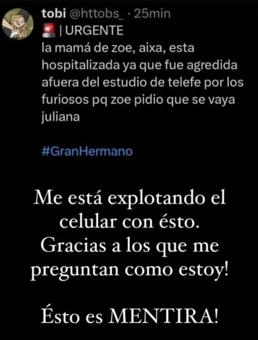 Algunos posteos en las plataformas digitales decían: “La mamá de Zoe, Aixa, está hospitalizada ya que fue agredida afuera del estudio por los furiosos porque Zoe pidió que se vaya Juliana”. Una versión que se viralizó con extrema velocidad y que causó preocupación extrema.