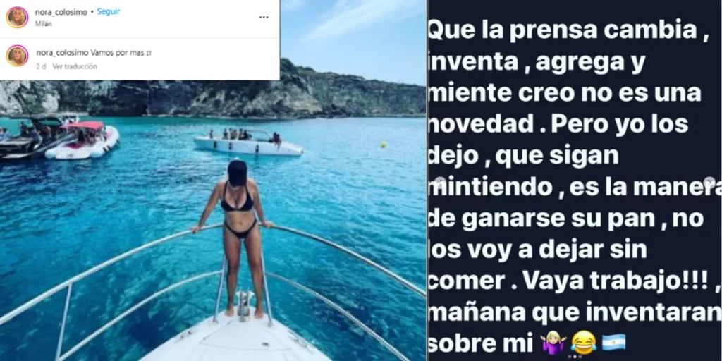 “¡Vaya trabajo! Mañana qué inventarán sobre mí”, agregó Nora poniendo de manifiesto su enojo para con la prensa al tiempo que acompañó los textos con postales de ella disfrutando de sus vacaciones en un barco y mientras navegaba por el continente europeo.