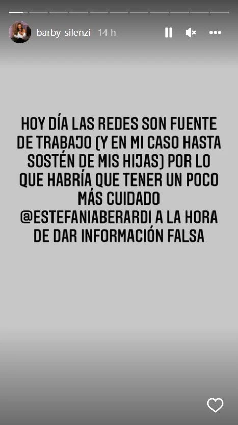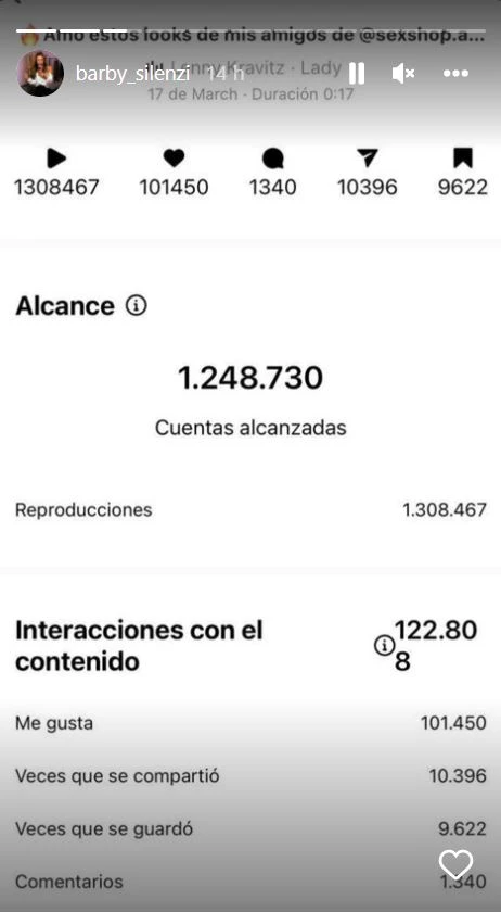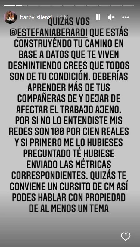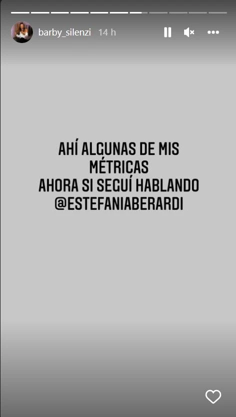 Pero a la bailarina, la investigación de la angelita le cayó pésimo, y así lo hizo ver con un explosivo descargo al que sumó pruebas y métricas de Instagram para desmentirla. “Se re preocupó Barby, mostró las estadísticas… Tranqui…”, dijo Berardi, cuando en el ciclo de América mencionaron la reacción sacada de Silenzi.