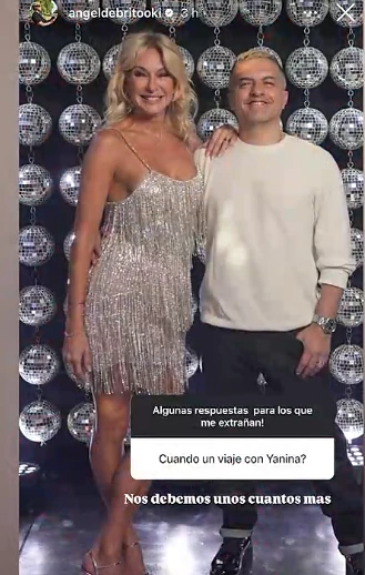 Ángel agarró su celular para activar un feedback con sus seguidores, ahí confirmó que le debe algo muy especial a Yanina Latorre. ¿Cómo? Una usuaria le preguntó: “¿Cuándo un viaje con Yanina Latorre?”. Así, De Brito corroboró que le adeuda a la angelita: “Nos debemos un par más”.