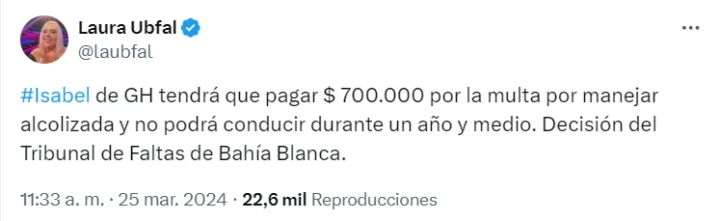 "Isabel de GH tendrá que pagar $ 700.000 por la multa por manejar alcoholizada y no podrá conducir durante un año y medio. Decisión del Tribunal de Faltas de Bahía Blanca", comentó la panelista de Intrusos vía Twitter.