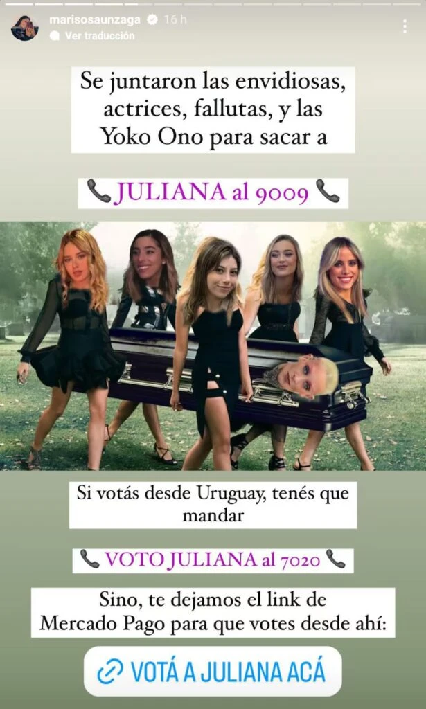 “Se juntaron las envidiosas, actrices, fallutas y las Yoko Ono”, escribió Marisol sobre esa historia que compartió en su perfil de Instagram donde se podía ver la cara de la última eliminada dentro de un ataúd que cargaban Coti Romero, Catalina Gorostidi, Florencia Regidor y Denisse González.