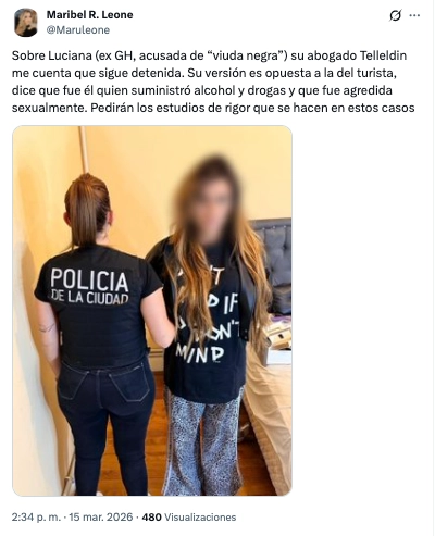 ¿Por qué? Porque en un principio se dijo que Luciana y su agente le robaron a dicho extranjero tras ir al hotel donde se alojaba, pero desde la defensa de la mediática el relato es otro. “Su abogado Telleldin me cuenta que sigue detenida. Su versión es opuesta a la del turista, dice que fue él quien suministró alcohol y drogas y que fue agredida sexualmente. Pedirán los estudios de rigor que se hacen en estos casos”, escribió la periodista a través de su cuenta de X.