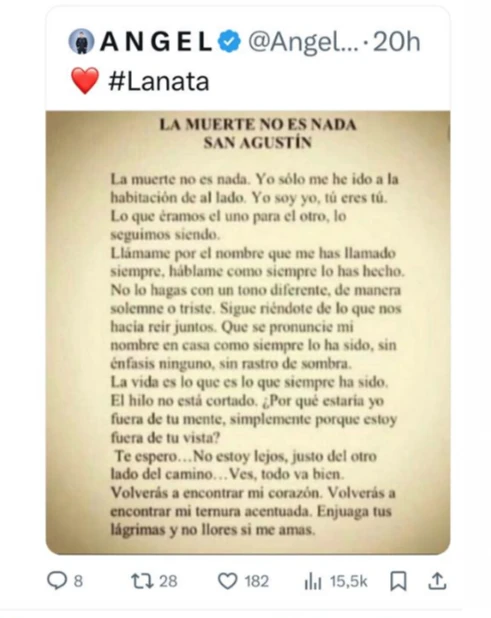 "La muerte no es nada. Yo sólo me he ido a la habitación de al lado. Yo soy yo, tú eres tú. Lo que eramos el uno para el otro, lo seguimos siendo. Llámame por el nombre que me has llamado siempre, háblame como siempre lo has hecho", enuncia la primera parte del escrito que publicó Angel y que le dedicó a Jorge junto a un emoji de corazón.
