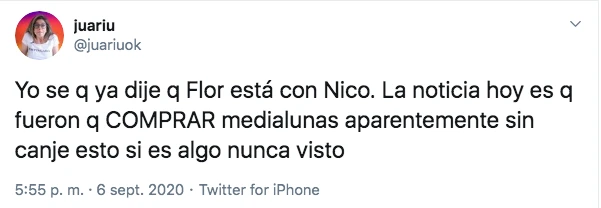 Cuando algunos seguidores le recriminaron que hablaba de una historia ya conocida, Juariu se mandó derecho viejo contra la pareja. "Yo sé que ya dije que Flor está con Nico. La noticia es que hoy fueron a COMPRAR medialunas aparentemente sin canje y esto sí es algo nunca visto".