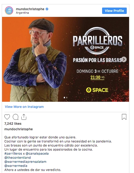 En ese posteo, en el que se ve un avance del ciclo que se emitirá en Space, el afamado chef agregó: “Cocinar con la gente se transformó en una necesidad en la pandemia. Las brasas son un punto de encuentro cálido por excelencia. Un lugar de encuentro para los apasionados de la cocina”.