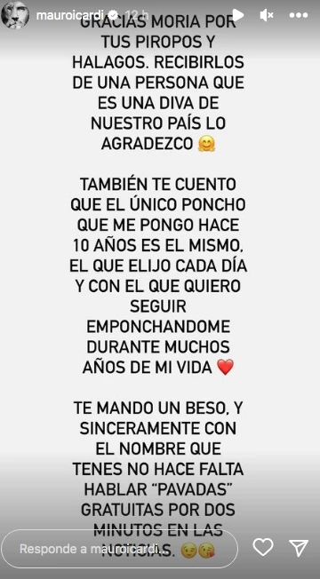 “Gracias Moria por tus piropos y halagos. Recibirlos de una persona que una diva de nuestro país, lo agradezco”, arrancó diciendo Mauro a través de una historia que publicó en su cuenta de Instagram en un mensaje que pareció, en un principio, ser "buena onda".