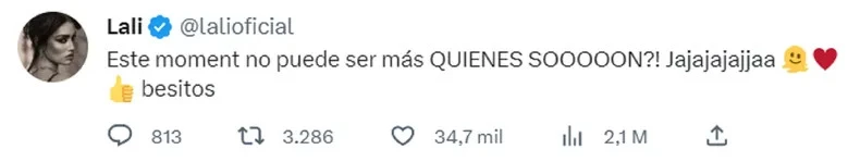 Ante estos comentarios irrespetuosos Lali saltó picante haciendo una referencia a Moria Casán: "Este ‘moment’ no puede ser más, ¿quiénes son? jajajaja. Besitos", ya que Trusso es un artista que no suele salir en las radios.