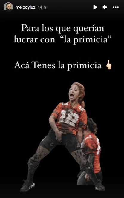 "Para los que querían lucrar con ‘la primicia’. Acá tenés la primicia", posteó Melody, junto a una imagen de ella en su época de participante en El hotel de los famosos, agarrándose sus partes íntimas.