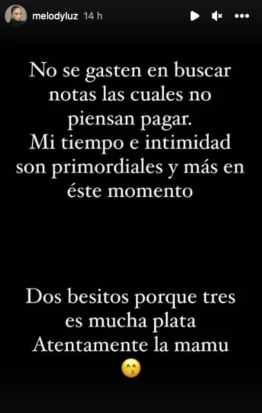Melody Luz y Alex Caniggia esperan a su primer hijo. Y tras anunciarlo, ella hizo furiosas definiciones en redes sociales. Melody se mostró molesta porque, según ella, los medios querían "lucrar con la primicia" y no le ofrecen dinero a cambio de notas.