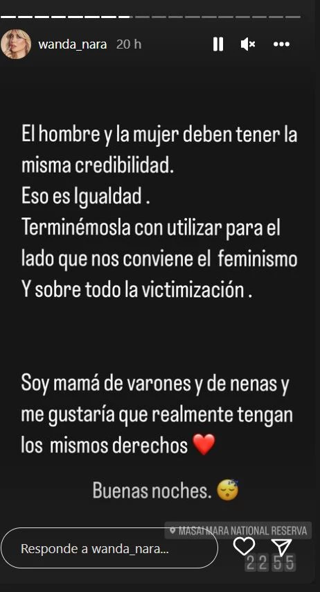 "El hombre y la mujer deben tener la misma credibilidad. Eso es igualdad. Terminémosla con utilizar para el lado que nos conviene el feminismo y sobre todo la victimización. Soy mamá de varones y nenas, y me gustaría que realmente tengan los mismos derechos. Buenas noches", escribió desde sus vacaciones de lujo en África.