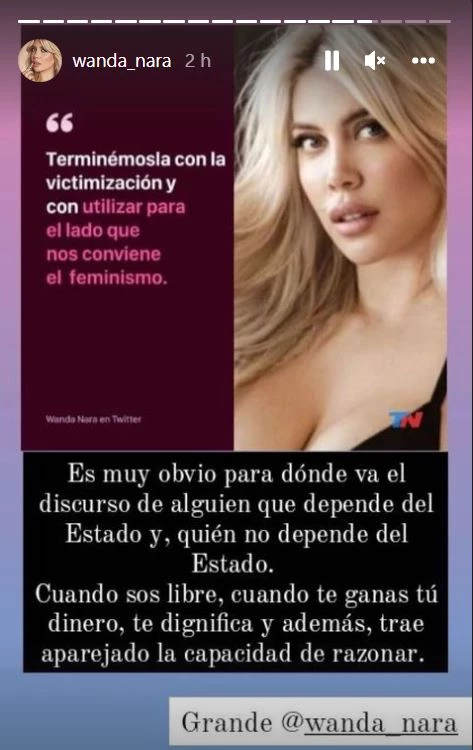 Más tarde, la empresaria replicó un comentario que le hicieron a raíz de su declaración: “Es muy obvio para dónde va el discurso de alguien que depende del Estado y quien no depende del Estado. Cuando sos libre, cuando ganas tu propio dinero, te dignifica y además, trae aparejado la capacidad de razonar. Grande, Wanda Nara”.