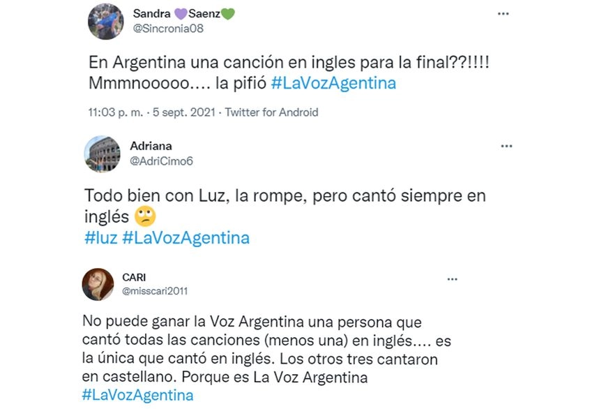 “Todo bien con Luz, la rompe, pero no entiendo por qué tantos temas en inglés”; “Perdón, pero es La Voz Argentina y si Luz cantó una sola vez en español, fue mucho”; “¿Una canción en inglés para la final? Me parece un gran error”; “No puede ganar Luz si cantó como mucho dos o tres temas en español y se llama La Voz Argentina”, le marcaron.