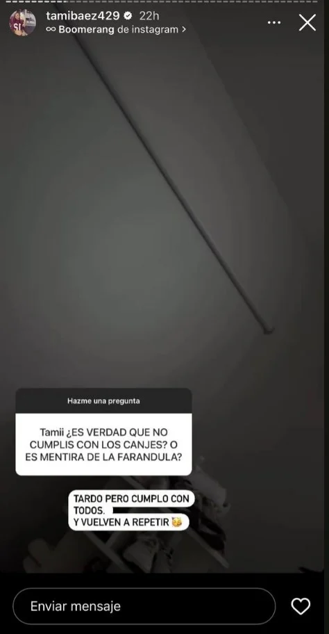 La pregunta del seguidor o seguidora decía: "Tami ¿Es verdad que no cumplís con los canjes o es mentira de la farándula?". Ante esto la ex pareja de L-Gante respondió: "Tardo... pero cumplo con todos... ¡Y vuelven a repetir!", aseguró la mamá de Jamaica.