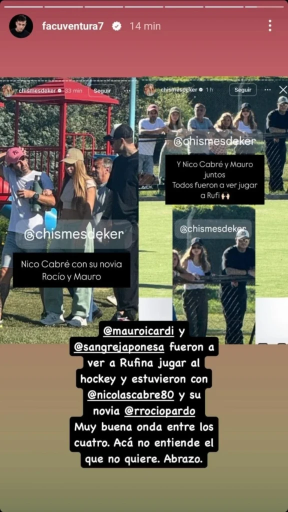 Nicolás Cabré y Mauro Icardi coincidieron el pasado fin de semana en un partido de hockey de Rufina. El actor fue a ver a su hija junto a su novia Rocío Pardo y la China Suárez, la mamá de la nena, asistió acompañada por el futbolista.