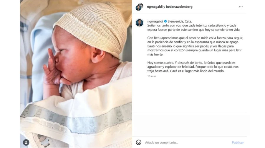 Magaldi acompañó a Betiana Wolenberg durante todo el embarazo y ambos celebraron este nuevo capítulo con enorme gratitud. El periodista dejó en claro que la llegada de su segunda hija fue un sueño cumplido después de momentos difíciles. Su publicación mostró cuánto significó para ellos atravesar cada etapa de la espera hasta tener a Cata en brazos.