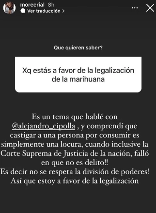 More Rial tiene la intención de sumarse al mundo de la política. Desde sus redes sociales, está empezando a plantear su postura ante determinados temas de agenda pública. Legalizar el consumo de marihuana suele generar opiniones divididas entre los que están a favor y quienes se expresan en contra.