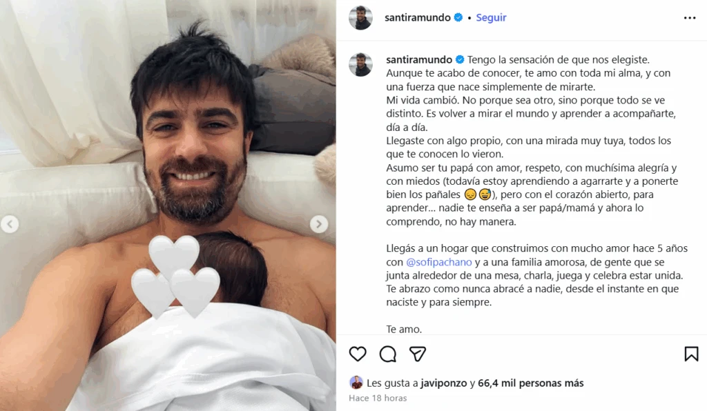 A días del nacimiento de Vito, Santiago Ramundo le dedicó una tierna carta. “Tengo la sensación de que nos elegiste. Aunque te acabo de conocer, te amo con toda mi alma, y con una fuerza que nace simplemente de mirarte”, escribió el compañero de vida de Sofía Pachano.