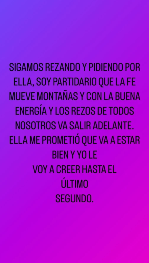 Así, el ex Gran Hermano pasó a ser un vocero más de la salud de su amiga y desde sus redes comunica todo lo referente a ella, mientras pide cadenas de oración y buena energía para la actriz que terminó con su salud arruinada tras operarse con Aníbal Lotocki.