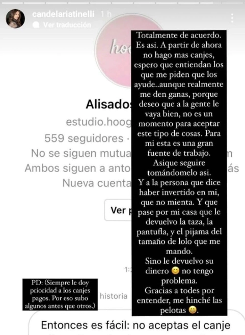 “Qué pena me da bloquear tanta gente”, publicó en su primer mensaje. “A partir de ahora no hago más canjes. Espero que entiendan los que me piden que los ayude. Aunque realmente me den ganas, porque deseo que a la gente le vaya bien. No es un momento para aceptar este tipo de cosas”, definió la hermana de Mica, Francisco, Lorenzo y Juanita Tinelli.