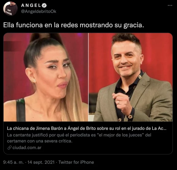 Ángel de Brito le respondió a su compañera de jurado de La Academia de Showmatch, Jimena Barón, luego de la frase que lanzó en La previa de la Academia. Resulta que el mobilero les pidió a Jimena, Pampita Y Guillermina Valdés, que opinaran sobre sus compañeros, allí Jimena habló sobre Ángel.