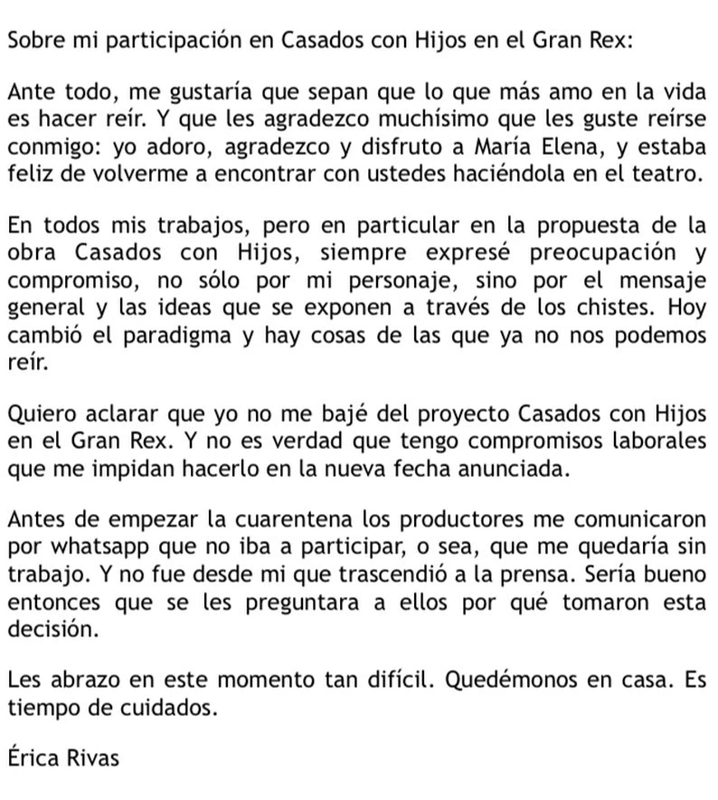 "Quiero aclarar que no me bajé del proyecto Casados con hijos en el Gran Rex. Y no es verdad que tengo compromisos laborales que me impiden hacerlo en la nueva fecha anunciada. Antes de empezar la cuarentena los productores me comunicaron por WhatsApp que no iba a participar, o sea, que me quedaría sin trabajo", agregó.