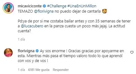 Mica subió un video en sus redes sociales donde se puede ver su panza de embarazada y bailando, lo que sorprendió es que lo hizo al ritmo de Una en un Millón, que quien es la intérprete, nada más y nada menos que Flor Vigna.