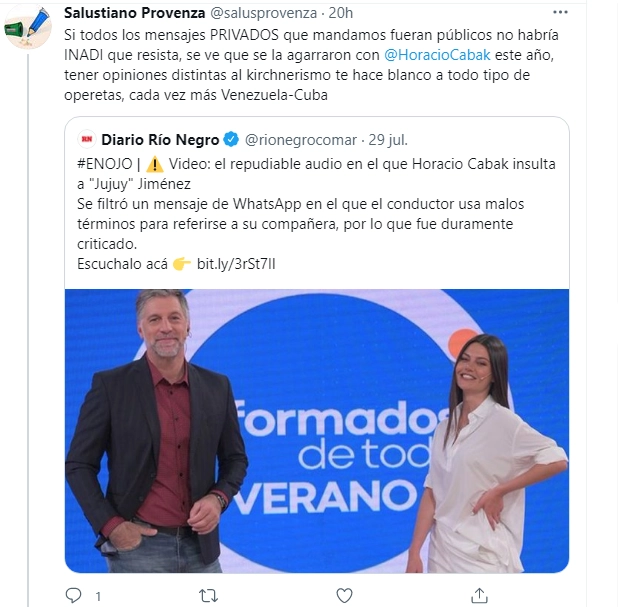 Un usuario desde la cuenta @salusprovenza, le dio retweet a la noticia que reflejaba la filtración del audio en cuestión y opinó: “Si todos los mensajes PRIVADOS que mandamos fueran públicos no habría INADI que resista, se ve que se la agarraron con Horacio Cabak este año, tener opiniones distintas al kirchnerismo te hace blanco a todo tipo de operetas, cada vez más Venezuela-Cuba”, analizó el twitero