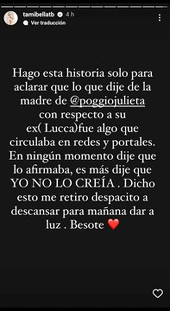Fue por ello que después del vivo de Julieta, la comunicadora salió a pedir disculpas urgentes y calmar las aguas: “Hago esta historia solo para aclarar que lo que dije de la madre de Julieta con respecto a su ex, Lucca, fue algo que circulaba en redes y portales. En ningún momento dije que lo afirmaba, es más, dije que yo no lo creía” y un emoji de corazón confirmando que el tema ya fue suficiente.