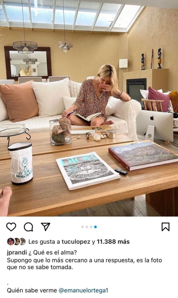 Es que mientras la blonda se encontraba en el sillón del living, cómodamente sentada y tomando apuntes con un cuaderno en mano, nunca se percató en que del otro lado de la mesa ratona estaba Ortega fotografiándola con su celular. Al ver el material en el carrete de su pareja Prandi no dudó ni un segundo en qué hacer con ellas.