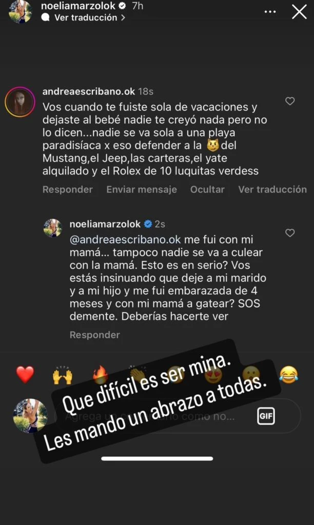 Lejos de dejar pasar esas críticas hacia su persona y evitar que ensucien su imagen pública, Noe escrachó a algunas de las seguidoras en cuestión capturando el comentario en su muro y reposteandolo entre sus historias de instagram. “Vos cuando te fuiste sola de vacaciones y dejaste al bebé nadie te creyó nada pero no lo dicen”, comenzó un internauta.