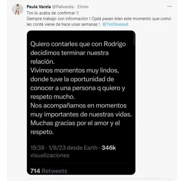 Como ella mismo lo remarcó, muchos estuvieron en su contra, pero al final, ella tenía la razón. "Tini lo acaba de confirmar!! Siempre trabajo con información! Ojalá pasen bien este momento que como les conté viene de hace unas semanas! No eran rumores, fui clarita!", comunicó junto a la captura del mensaje de Stoessel.