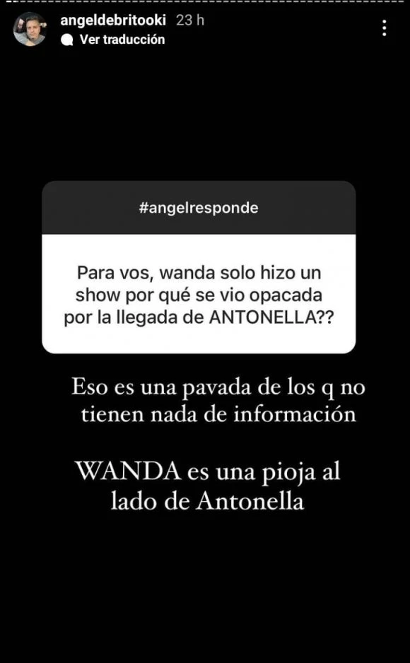 El usuario preguntó: “Para vos, ¿Wanda solo hizo un show porque se vio opacada por la llegada de Antonela?”. De Brito fiel a su estilo ácido, respondió contundente: “Eso es una pavada de los que no tienen nada de información. Wanda es una pioja al lado de Antonela”, lanzó.