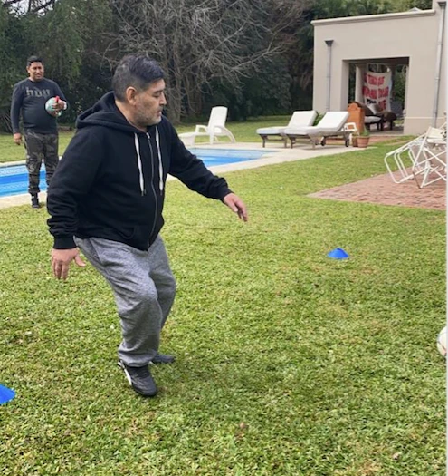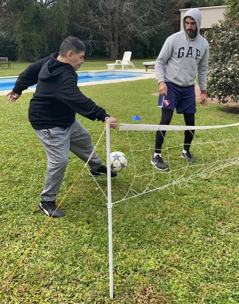 "Además -señalan- la idea es que Diego pierda algunos kilos que sumo en esta larga cuarentena que lo mantienen encerrado en su casa hace más de 100 días. El plan marcha a la perfección y una muestra de eso es que Diego se animó a desafiar el frío y se prendió en un partido de fútbol tenis con su médico personal".