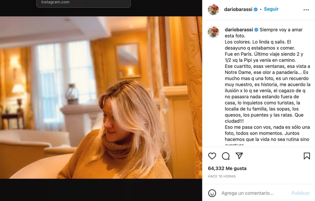 “Siempre voy a amar esta foto. Los colores. Lo linda que salís. El desayuno que estábamos por comer. Fue en París. Último viaje siendo 2 y 1/2 xq la Pipi ya venía en camino. Ese cuartito, esas ventanas, esa vista a Notre Dame, ese olor a panadería...”, comenzó diciendo Barassi en la publicación.