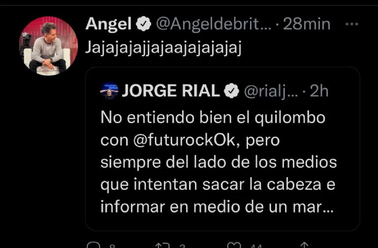 En el medio de todo esto, Rial intentó meterse y Ángel de Brito se le rió en la cara. “No entiendo bien el quilombo con FutuRock, pero siempre del lado de los medios que intentan sacar la cabeza e informan en medio de un mar de tiburones mediáticos. Solo quería decir eso. Sigan con lo suyo”, contó Jorge.