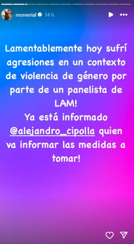 Morena arrancó por el costado legal. “Lamentablemente hoy sufrí agresiones en un contexto de violencia de género por parte de un panelista de LAM. Ya está informado Alejandro Cipolla, quien va a informar las medidas a tomar”, escribió la joven.