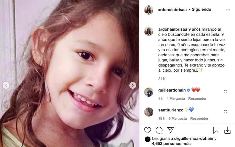 “9 años mirando al cielo buscándote en cada estrella. 9 años que te siento lejos pero a la vez cerca. 9 años escuchando tu voz y tu risa tan contagiosa en mi mente cada vez que me esperabas para jugar, bailar y hacer todo juntas, sin despegarnos. Te extraño y te abrazo al cielo”, le expreso Brisa a Blanca, que además de familiar era su adorada amiga.