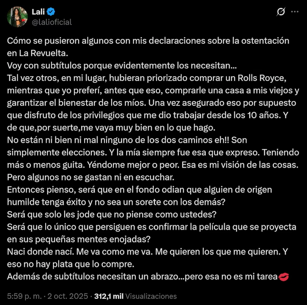 Cansada de las acusaciones, Lali eligió contestar desde su cuenta de X y lanzó un descargo directo: “Tal vez otros, en mi lugar, hubieran priorizado comprar un Rolls-Royce, mientras que yo preferí, antes que eso, comprarle una casa a mis viejos y garantizar el bienestar de los míos”.