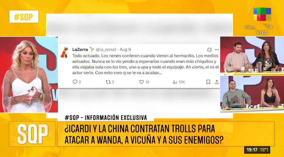 “Yo estoy convencida que algunas de las partes contratan trolls para Twitter porque no puede ser la cantidad de bardeadas que recibe Wanda todos los días, es increíble”, señaló Yanina en SQP (América), quien también mencionó que lo mismo ocurrió con Vicuña cuando fue a buscar a sus hijos a Ezeiza recién llegados de Turquía tras despedirse de la China.