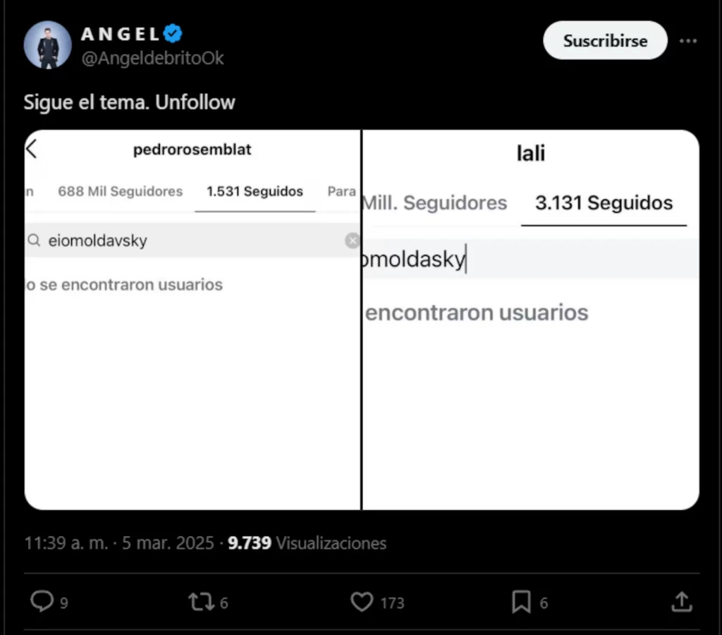 Ángel de Brito lo compartió en su cuenta de X y también mostró que Pedro Rosemblat, novio de la actriz, no sigue a Eial. "Nos conocimos en un evento de una marca de alcoholes que nos había llevado a hacer contenido", había dicho Moldavsky.