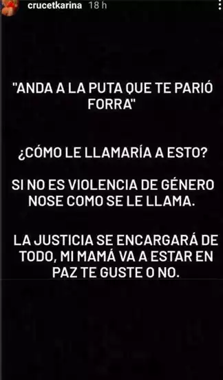 En otra publicación, Karina dejó entrever que Tony le impidió el contacto telefónico con su madre y exclamó: “‘Andá a la put* que te parió, forra’. ¿Cómo se llamaría esto? Si no es violencia de género no sé cómo se llama. La Justicia se encargará de todo. Mi mamá va a estar en paz te guste o no”.