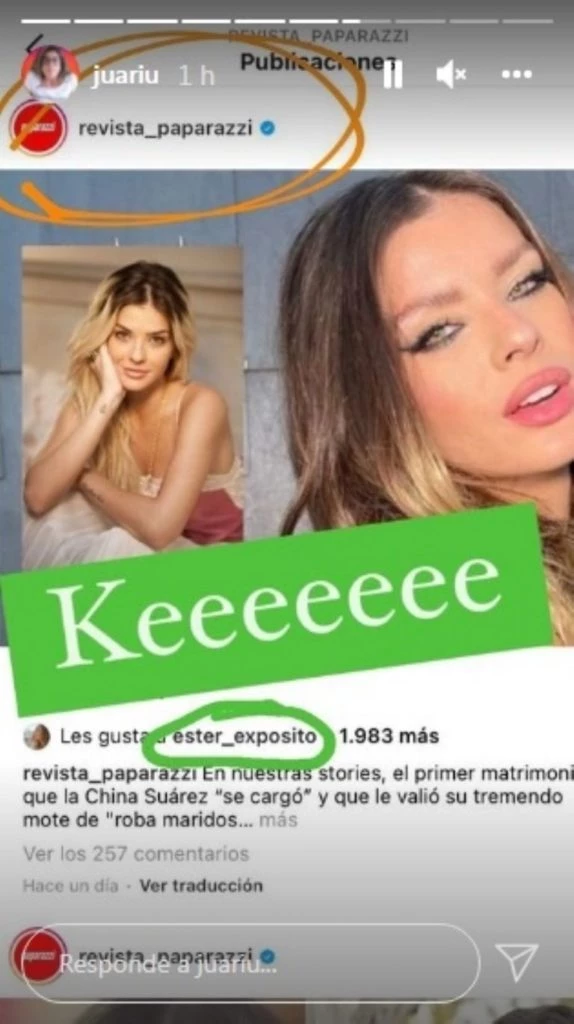 Por su parte, esta mañana, la periodista Juariu descubrió una noticia bomba: Ester le había puesto un like a una nota de la revista Paparazzi en la que se criticaba a Suárez. "El primer matrimonio que la China se cargó y que le valió su tremendo mote de 'roba maridos'", decía el titular.
