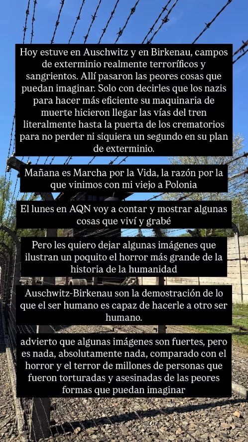 “Hoy estuve en Auschwitz y en Birkenau. Allí pasaron las peores cosas que puedan imaginar”, comenzó diciendo, además de hacer foco en las vías de los trenes que eran la entrada a la muerte o, como bien dijo el propio periodista: “literalmente hasta la puerta de los crematorios”. Todo este viaje se dio en el marco de la Marcha por la Vida, la peregrinación que año tras año convoca a miles de descendientes de víctimas del Holocausto, sobrevivientes y jóvenes de todo el mundo.