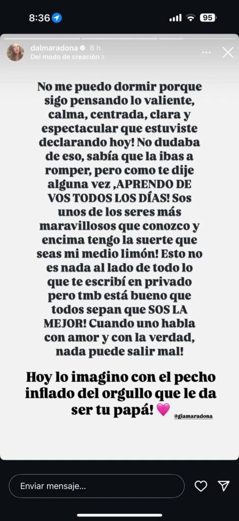 “Sos unos de los seres más maravillosos que conozco y encima tengo la suerte que seas mi medio limón! Esto no es nada al lado de todo lo que te escribí en privado pero tmb está bueno que todos sepan que sos la mejor. Cuando uno habla con amor y con la verdad, nada puede salir mal. Hoy lo imagino con el pecho inflado del orgullo que le da ser tu papá! @giamaradona”, cerró.