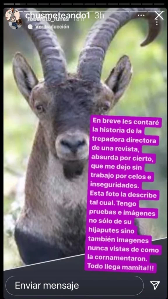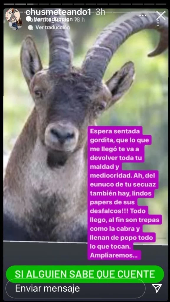 Luego se posó en lo vinculado al aspecto amoroso de esta persona: “Esta foto la describe tal cual. Tengo pruebas e imágenes no solo de tu hijaputez sino también imágenes nunca vistas de como lo cornamentaron. Todo llega mamita”. Picante.