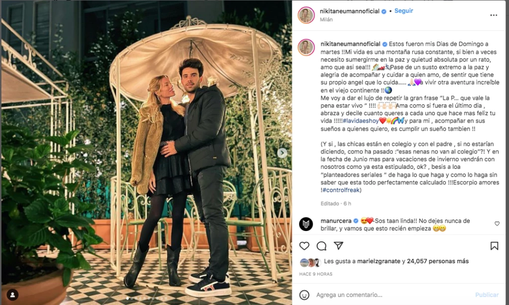 Además de todo eso, Nikita arrojó una confirmación de lo que piensa hacer para evitar estar en el nacimiento del hijo de Mica Viciconte y Fabián Cubero, dado que puso: “Y en la fecha de junio, más para vacaciones de invierno, vendrán con nosotros mis hijas como ya está estipulado, ¿ok?”.